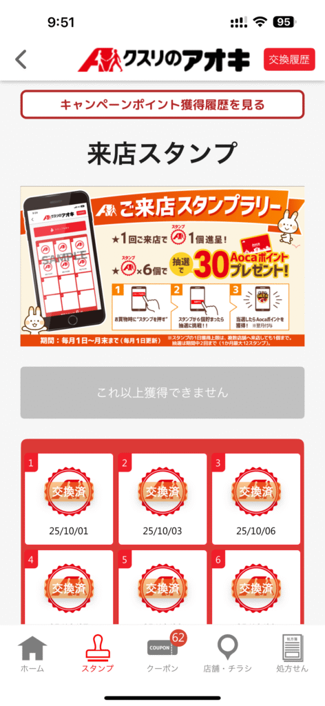 アプリの中に、「来店スタンプ」という項目があります。アオキに来店してアプリを開いて画面にあるスタンプを押すをタップすると一日に一個づつスタンプがたまります。そして、6回に1回抽選で30ポイントが当たります。